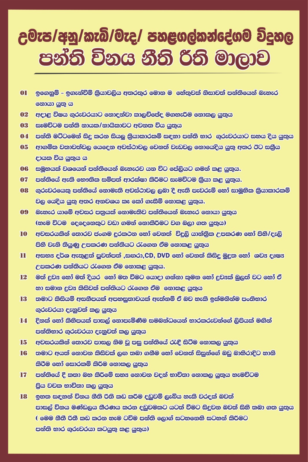 පන්ති විනය නීති රීති මාලාව සිසු